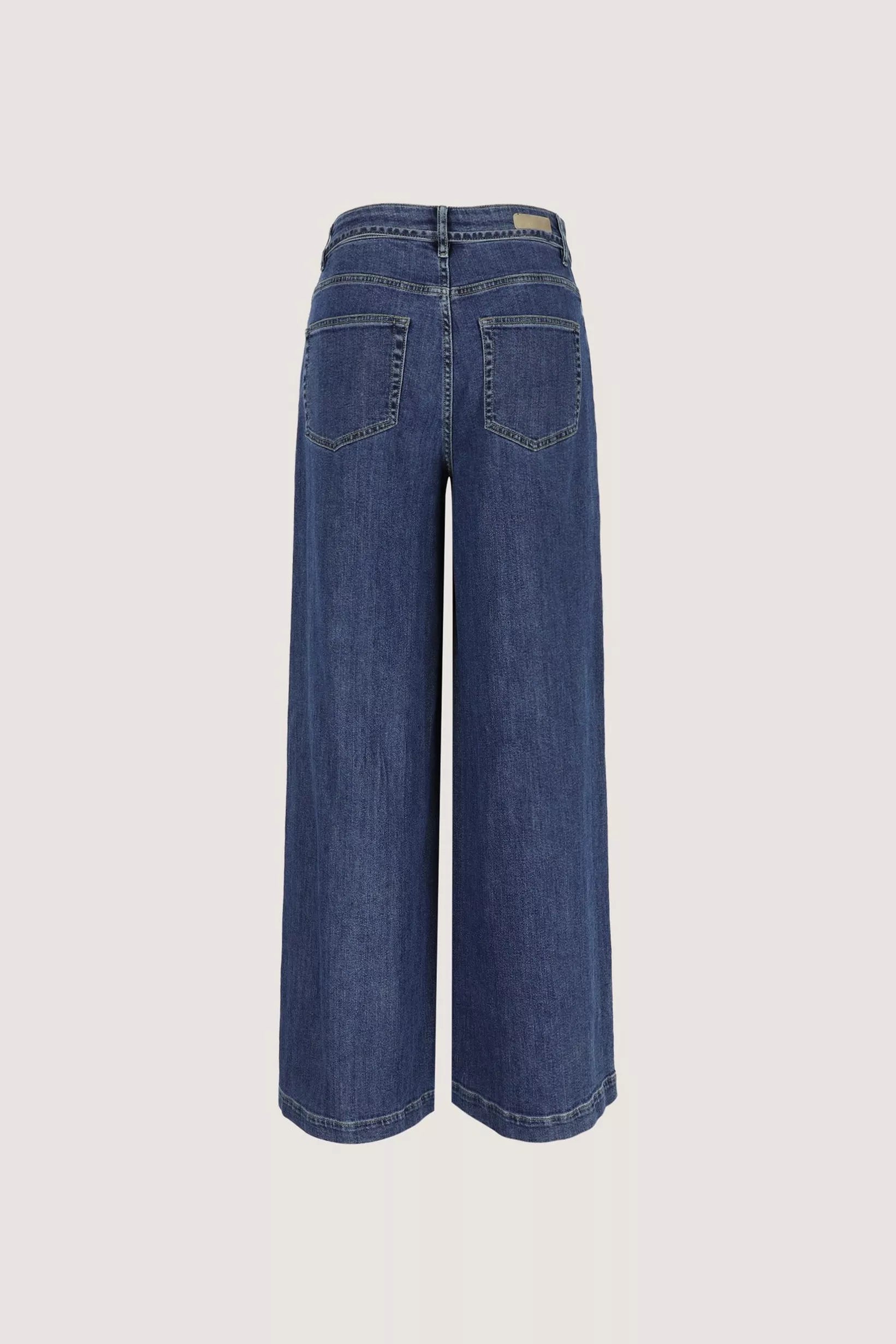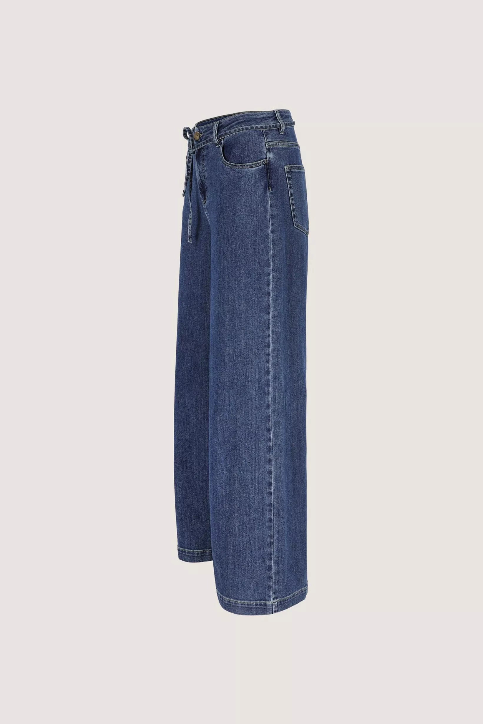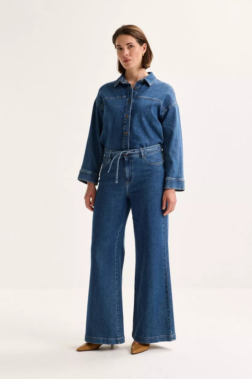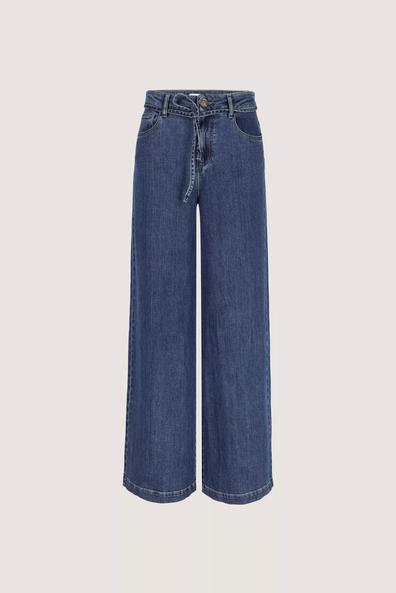 Met dit model geeft Améline een frisse, vrouwelijke draai aan de klassieke 5-pocketjeans. Deze wijde broek in soepel, elastisch denim volgt je bewegingen en flatteert je silhouet met een hoge taille en een fijne bindceintuur.