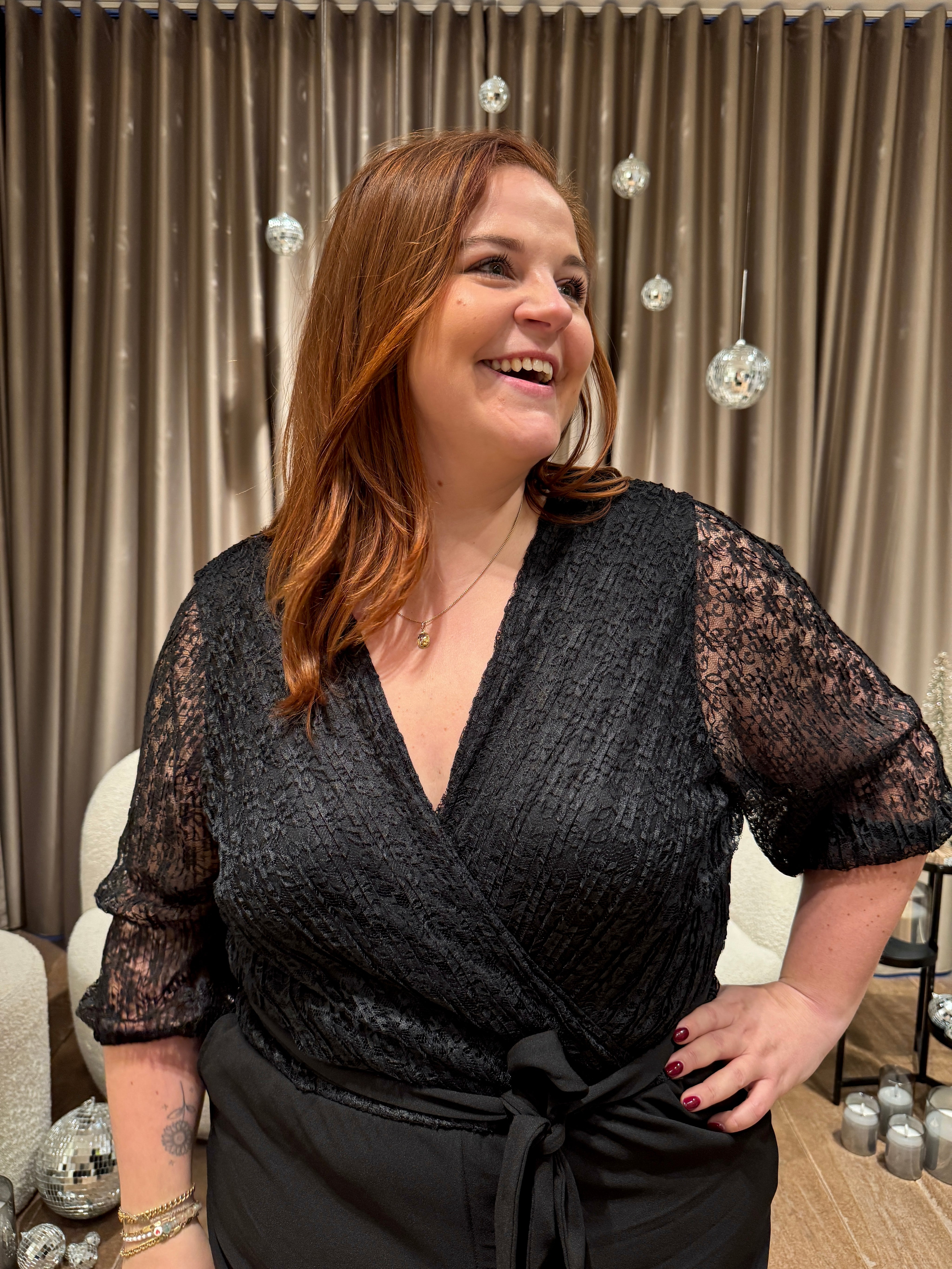 Deze zwarte jumpsuit van ONLY Carmakoma straalt pure elegantie uit met zijn kanten bovenstuk en flatterende overslag. De semi-doorschijnende mouwen en het ceintuur in de taille geven het geheel een vrouwelijke, verfijnde touch. Dankzij de comfortabele stof en rechte pijpen zit hij niet alleen zalig, maar oogt hij ook super chic. Perfect voor de feestdagen of elke gelegenheid waarop je effortless classy wilt verschijnen. ✨