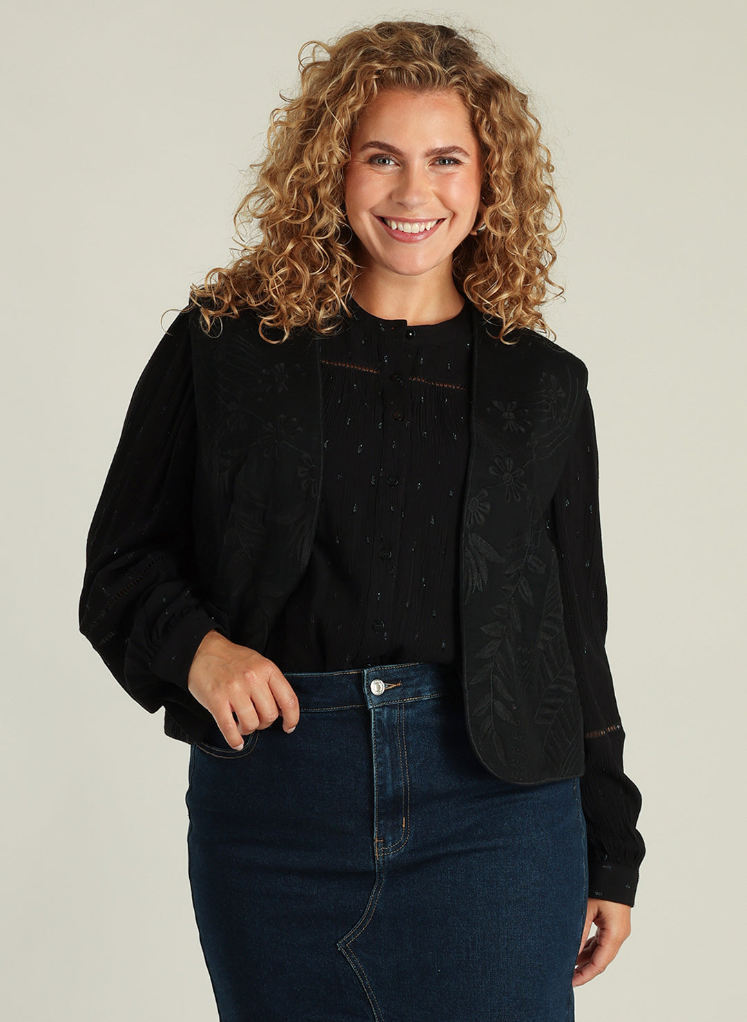 Dit zwarte gilet met mooi borduurwerk is echt een leuke eyecatcher. Het is lekker zacht en voelt fijn aan, perfect om over een shirt of blouse te dragen. Ideaal als je net dat beetje extra wil toevoegen aan je outfit zonder moeite.