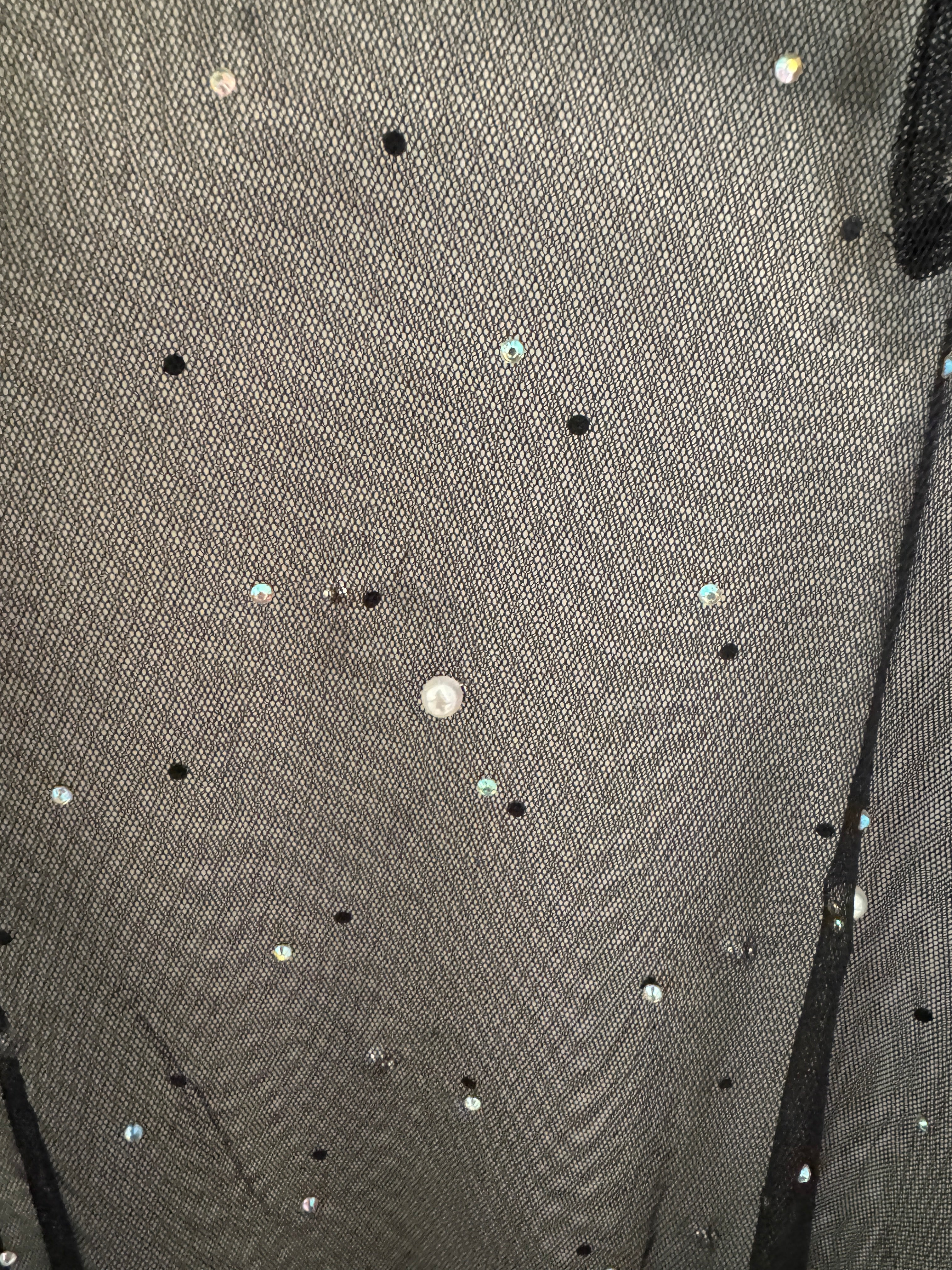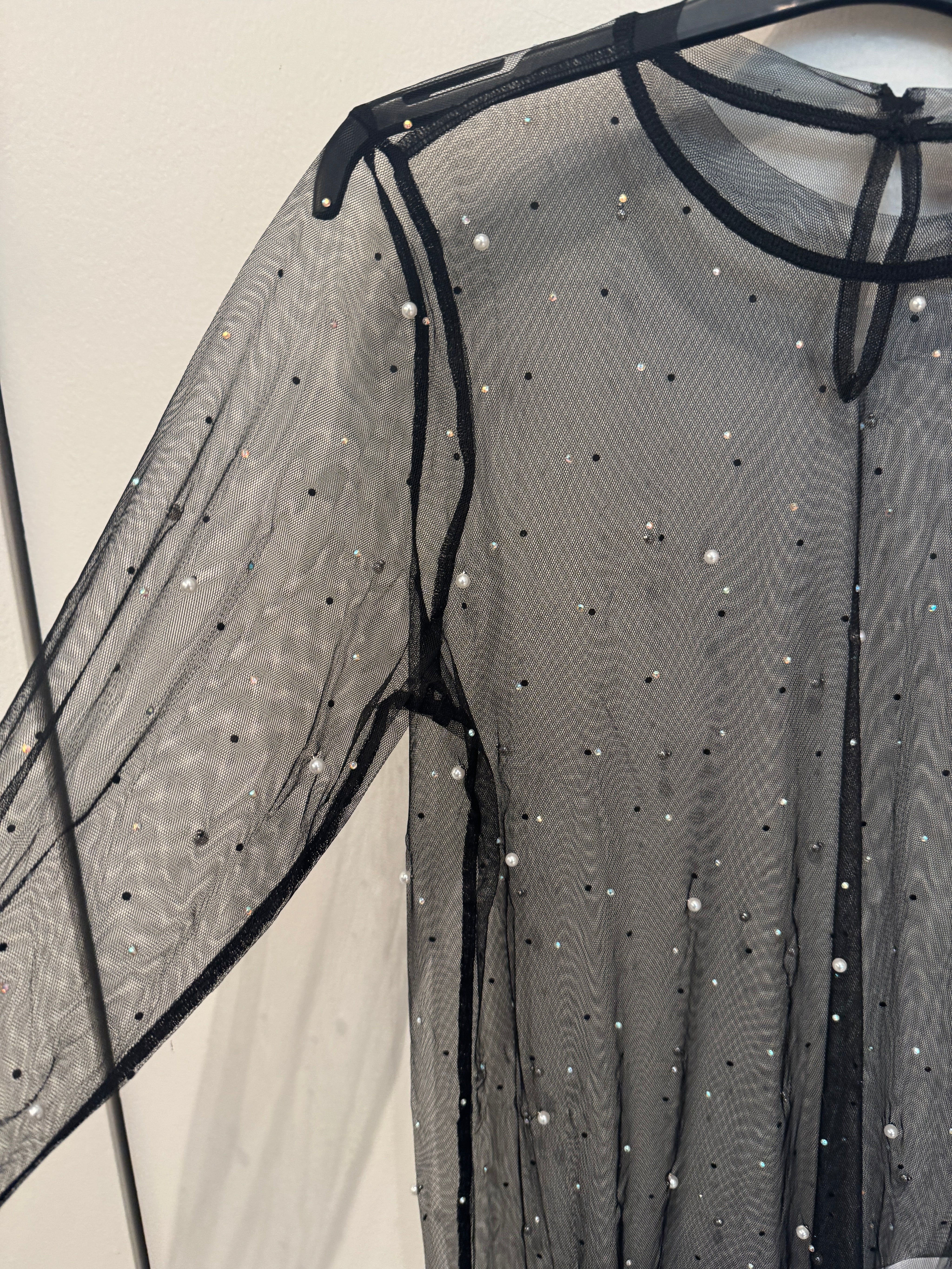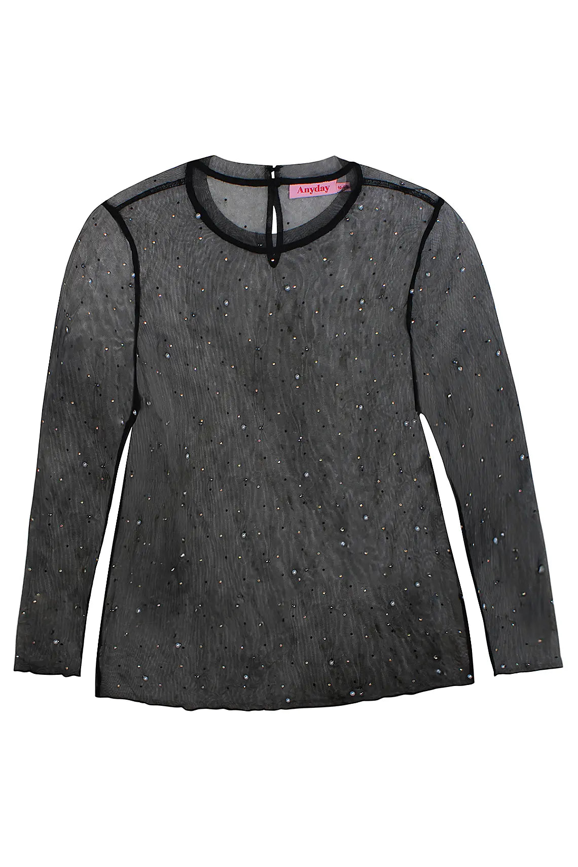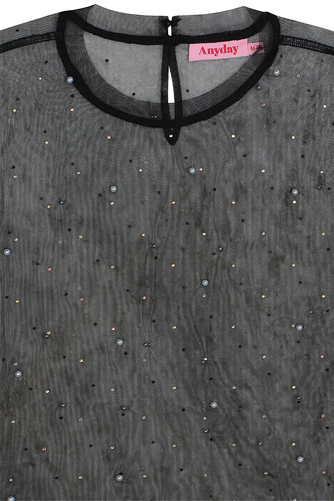 Deze zwarte mesh top van Anyday is dé perfecte layering piece om je outfit net dat tikkeltje extra te geven. De transparante stof is subtiel versierd met kleine pareltjes en glinsterende steentjes, wat zorgt voor een luxueuze, feestelijke uitstraling zonder te overdrijven.
