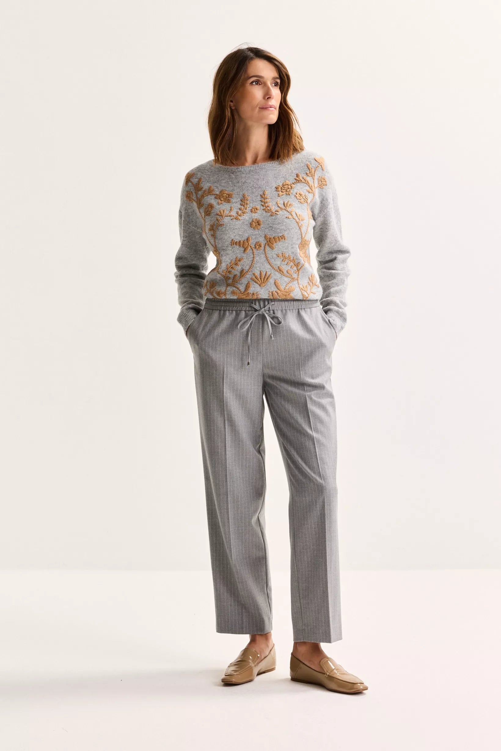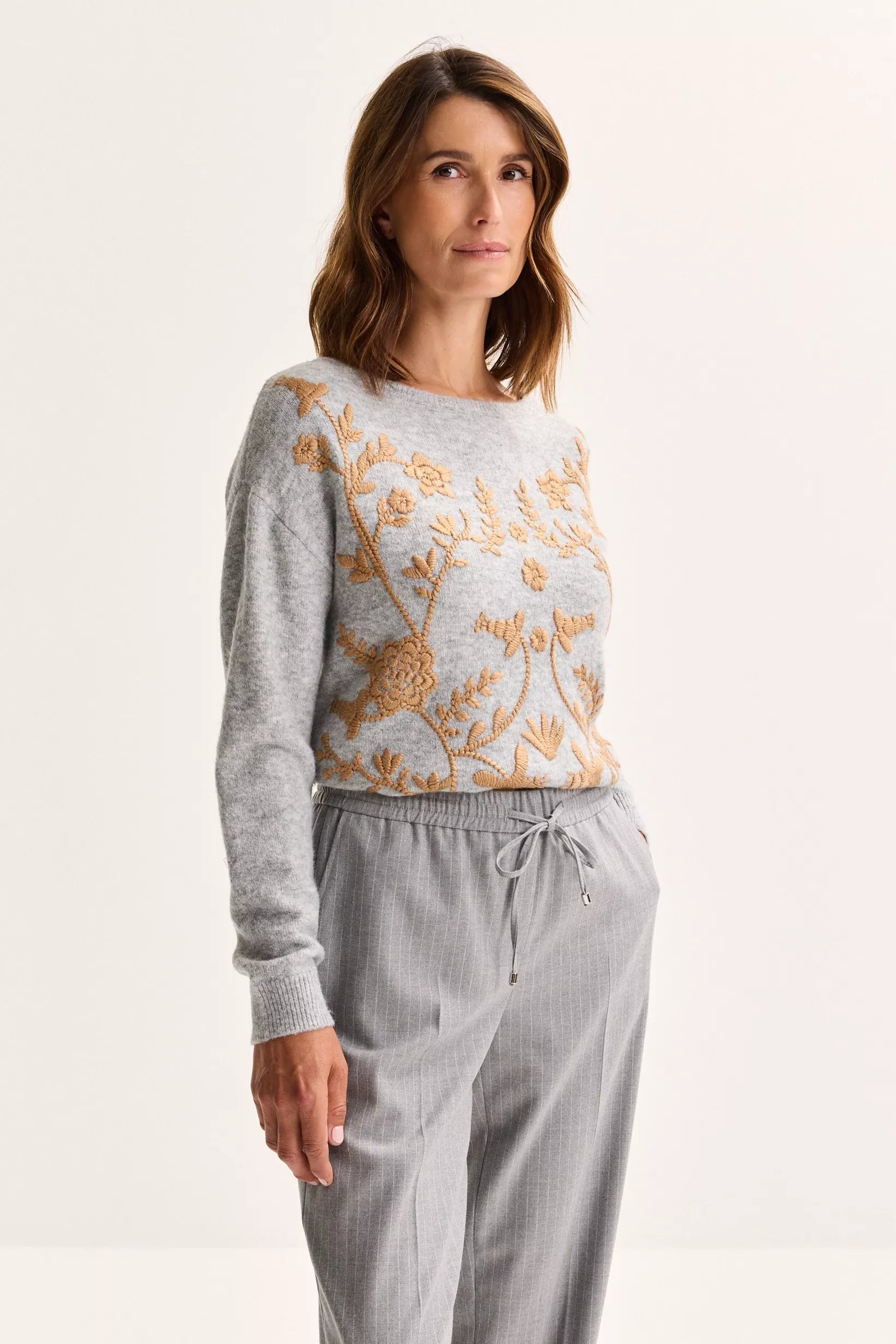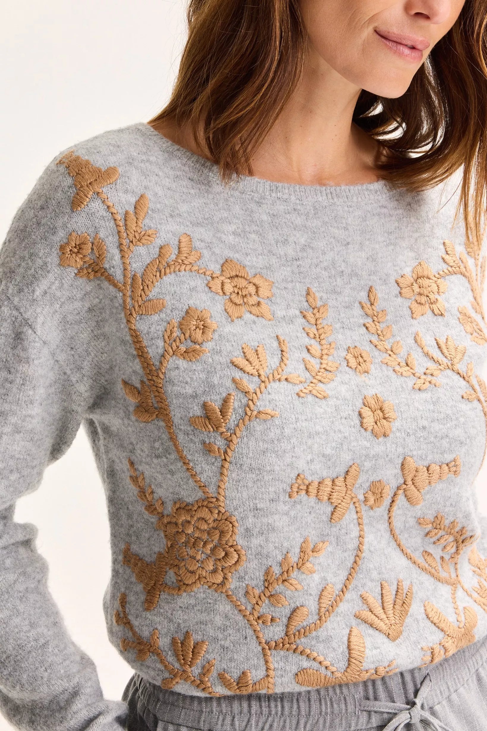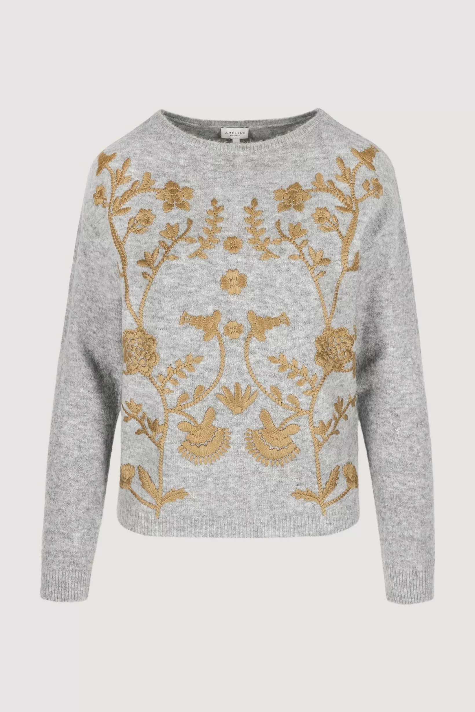 Deze streelzachte trui van Améline combineert preppy charme met een Scandinavische knipoog. De voorkant is rijkelijk geborduurd met een rustiek bloemenmotief in dikke zilverdraad, wat haar een unieke textuur en subtiele glans geeft. De boothals en laag ingezette mouwen zorgen voor een ontspannen silhouet met karakter.