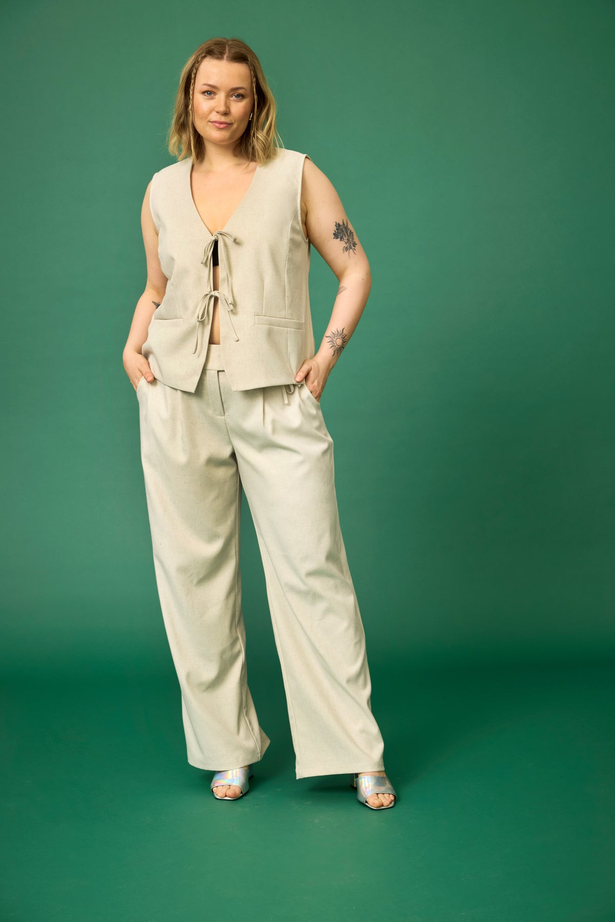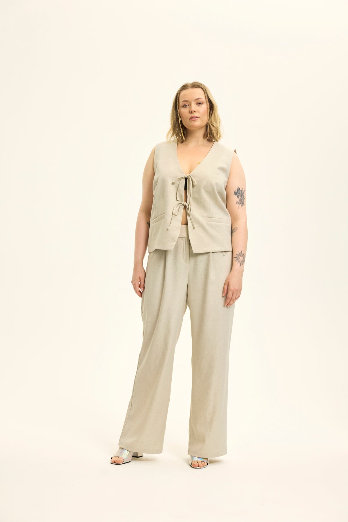 Deze mouwloze waistcoat van Anyday is zo’n item dat je eindeloos kan combineren. Hij komt in een zandgrijs/beige achtige tint en heeft superleuke strikjes vooraan die zorgen voor een vrouwelijke, speelse touch.