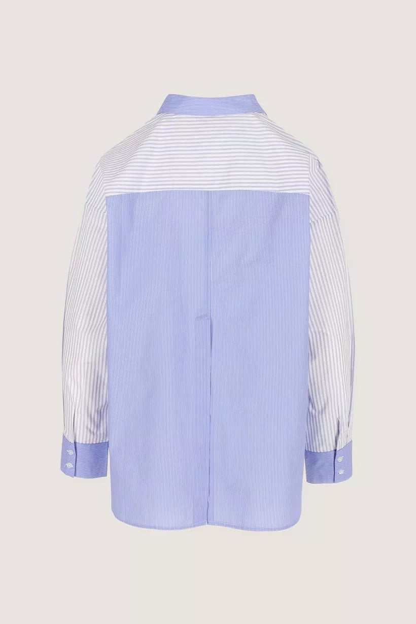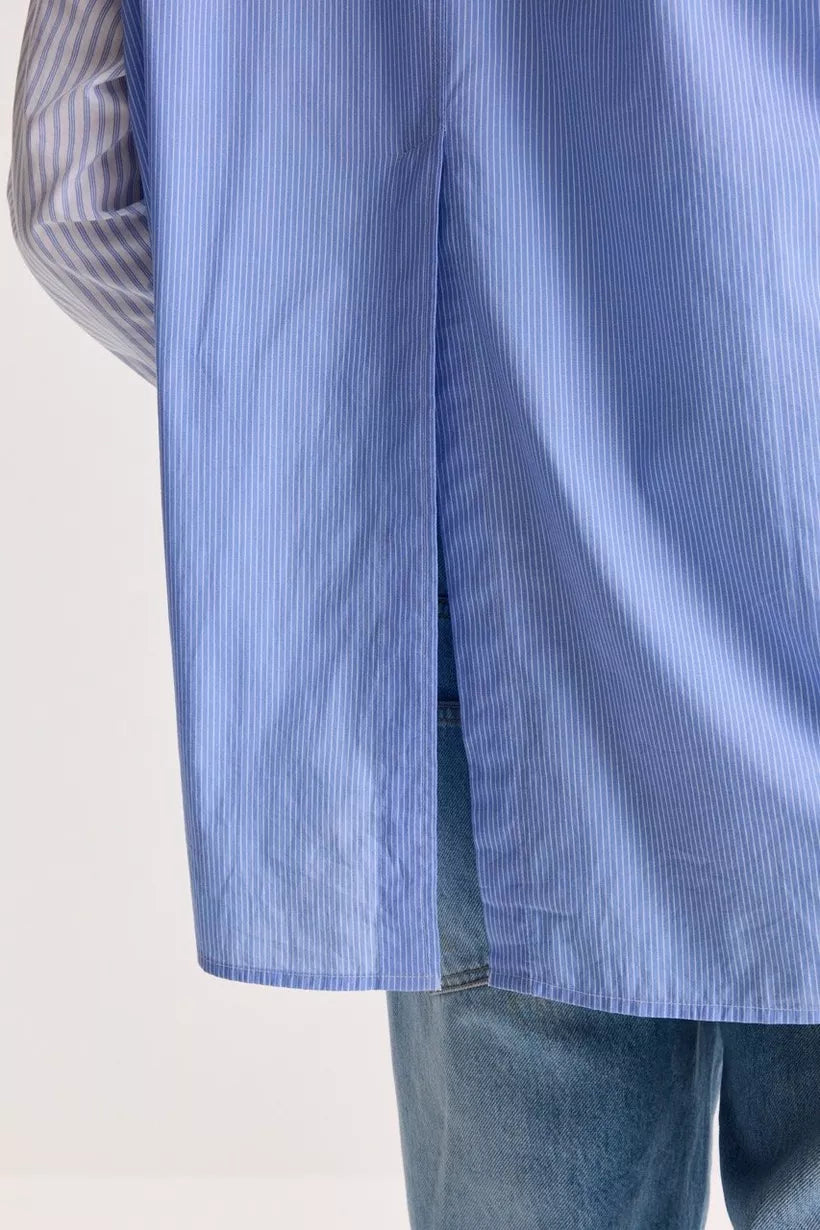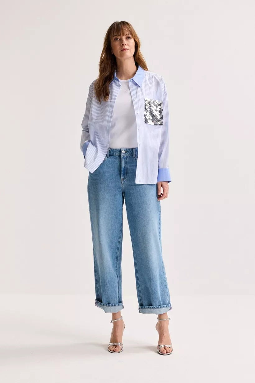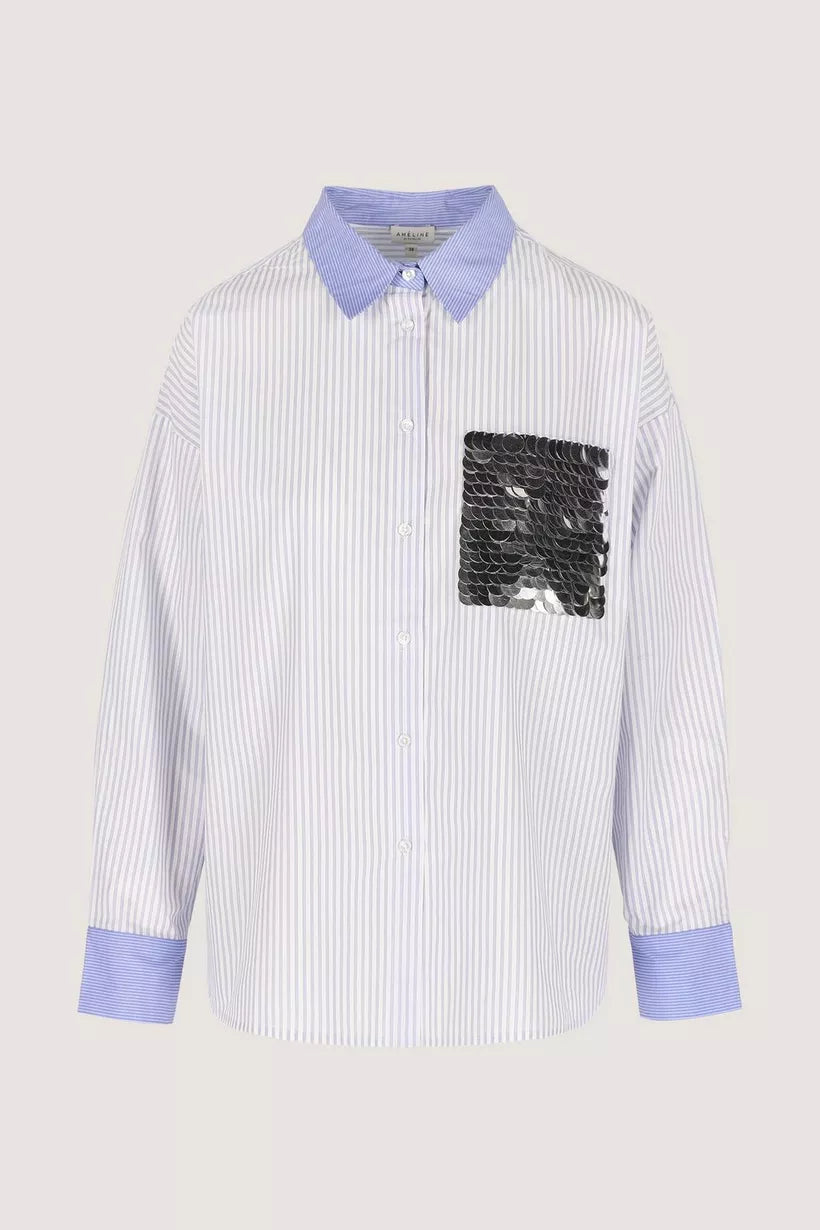 Een preppy popeline hemd dat klassiek lijkt, tot de details hun rebellie tonen: fijne strepen, een opgezette zak vol speelse pailletten, een hoge rugsplit en een zwierige afgeronde zoom. Een vleugje campus, een snuifje glamour — college chic met een knipoog. Deze blouse valt oversized, en is bedoeld om echt losser te dragen!