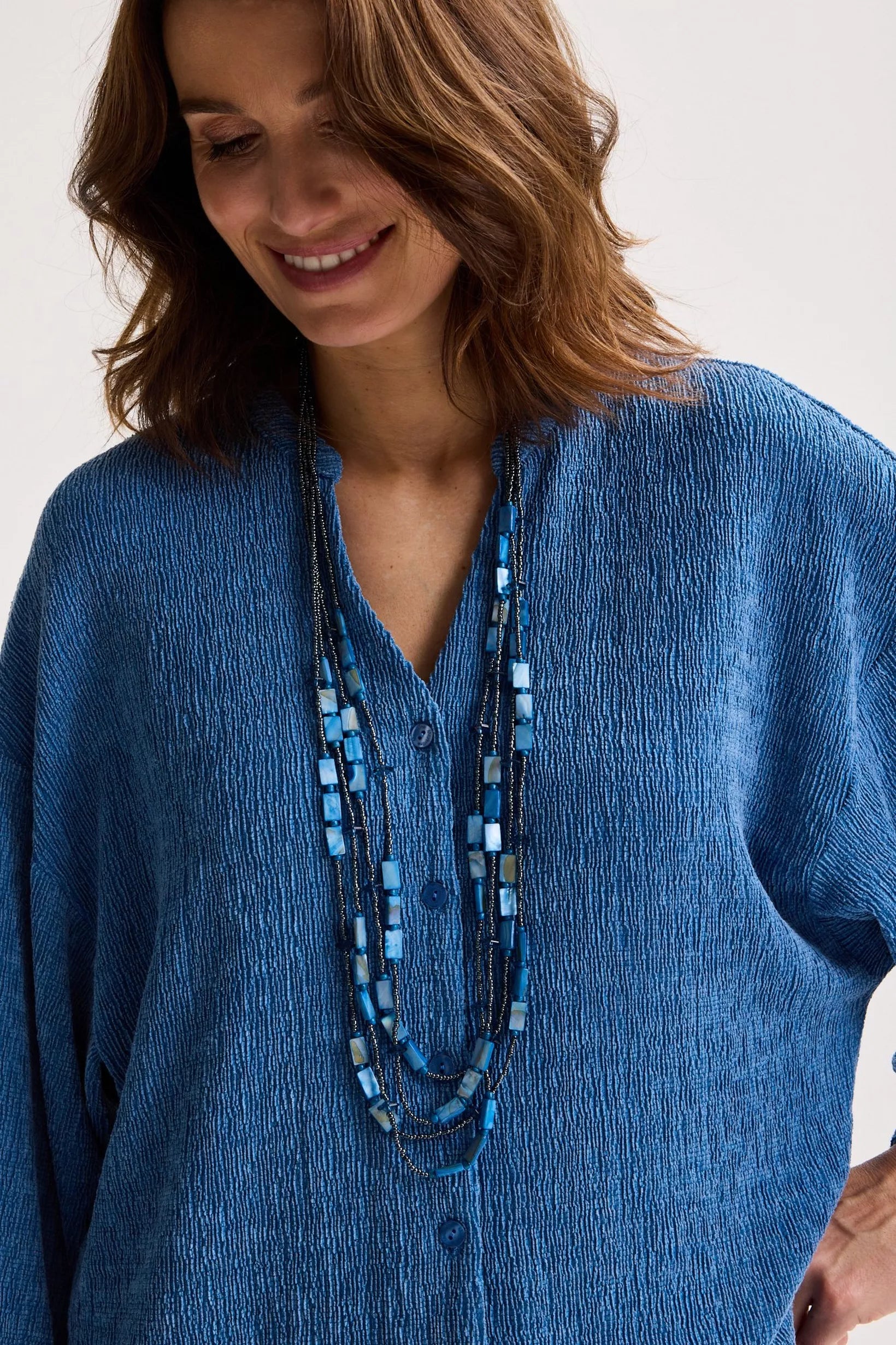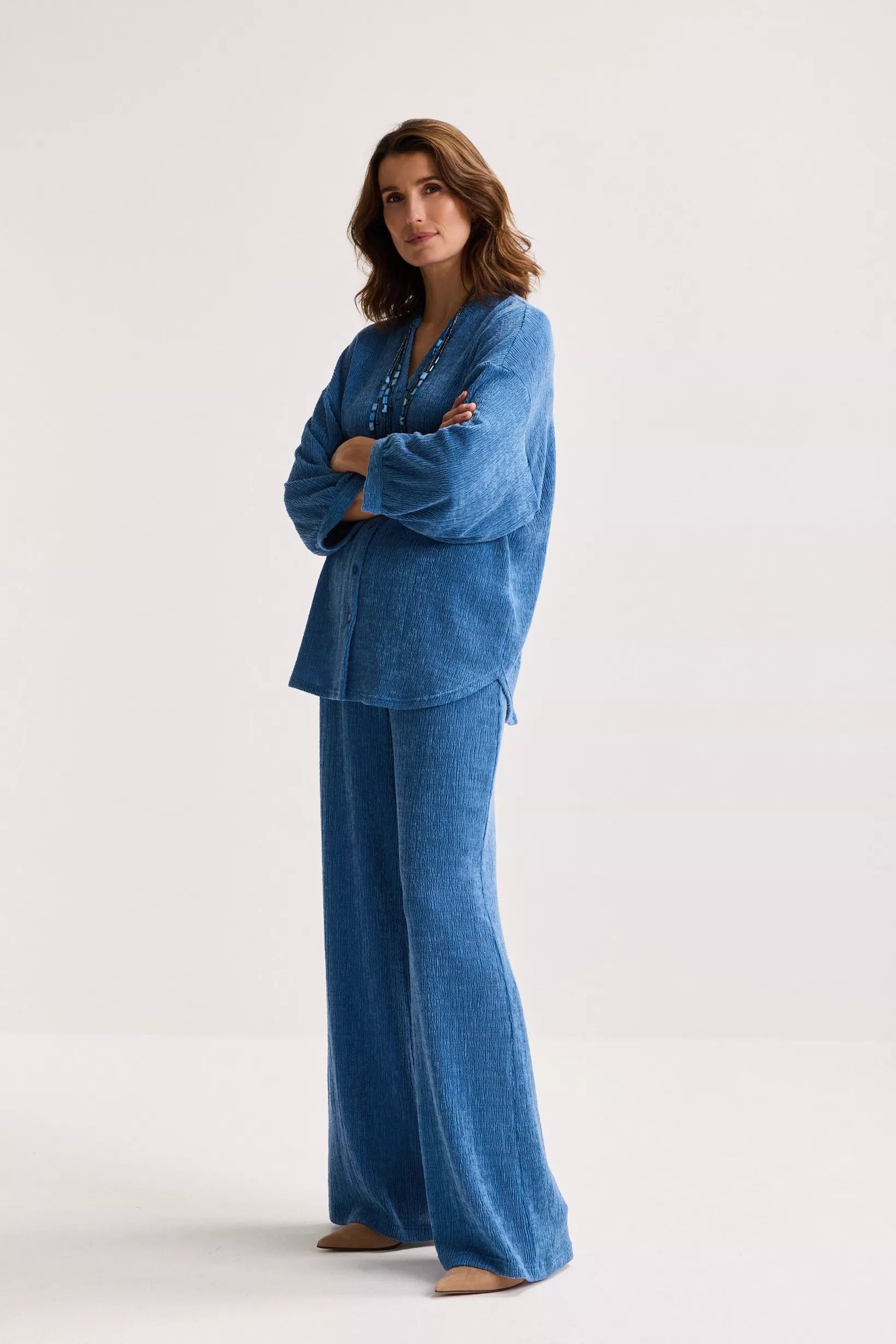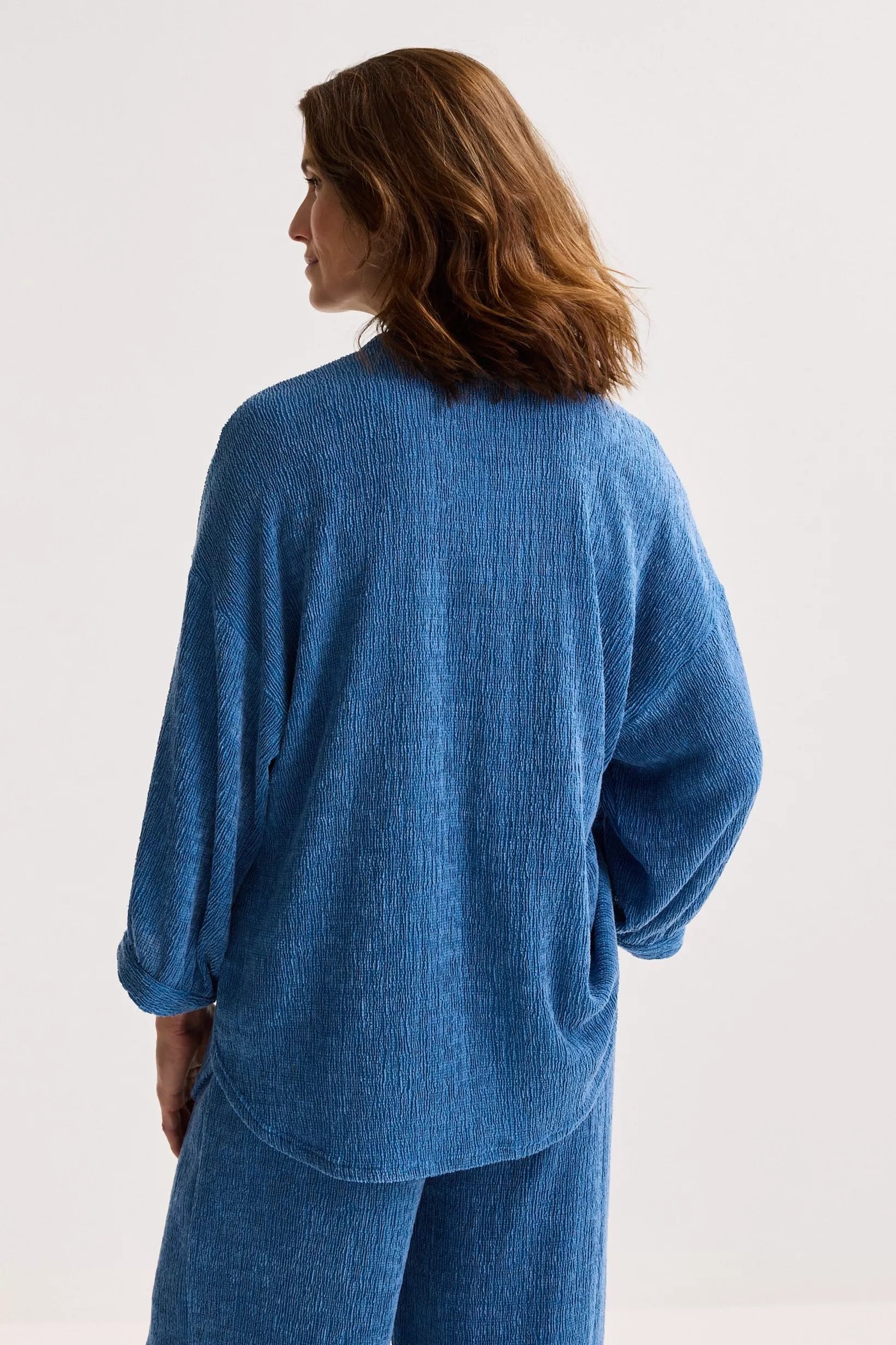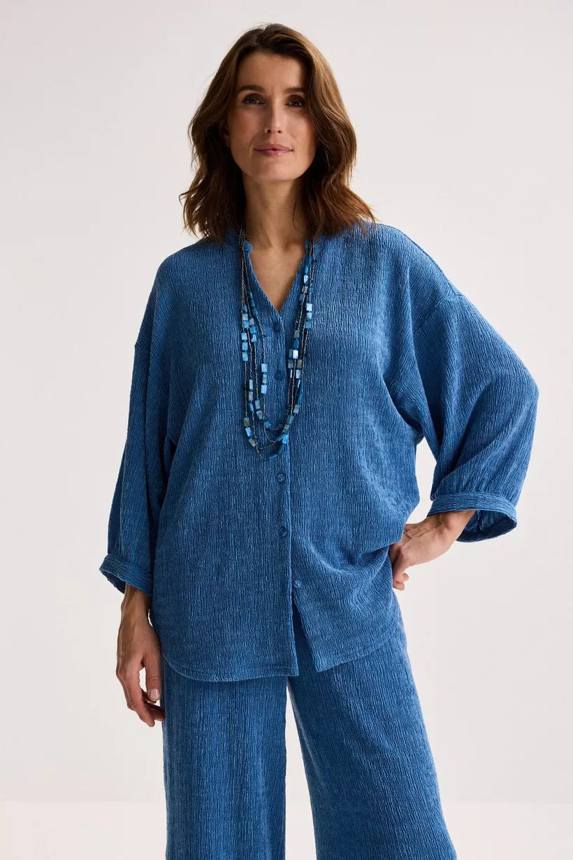 Deze lange hemdblouse, met haar laag ingezette en extra wijde driekwartsmouwen van aangename stretch crinklestof, is veelzijdig genoeg om ook als jasje te dragen, het hele jaar door. Dankzij de tijdloze snit en het topmateriaal zul je er jarenlang plezier van hebben. Combineer deze met de CARIA broek voor een prachtig geheel!