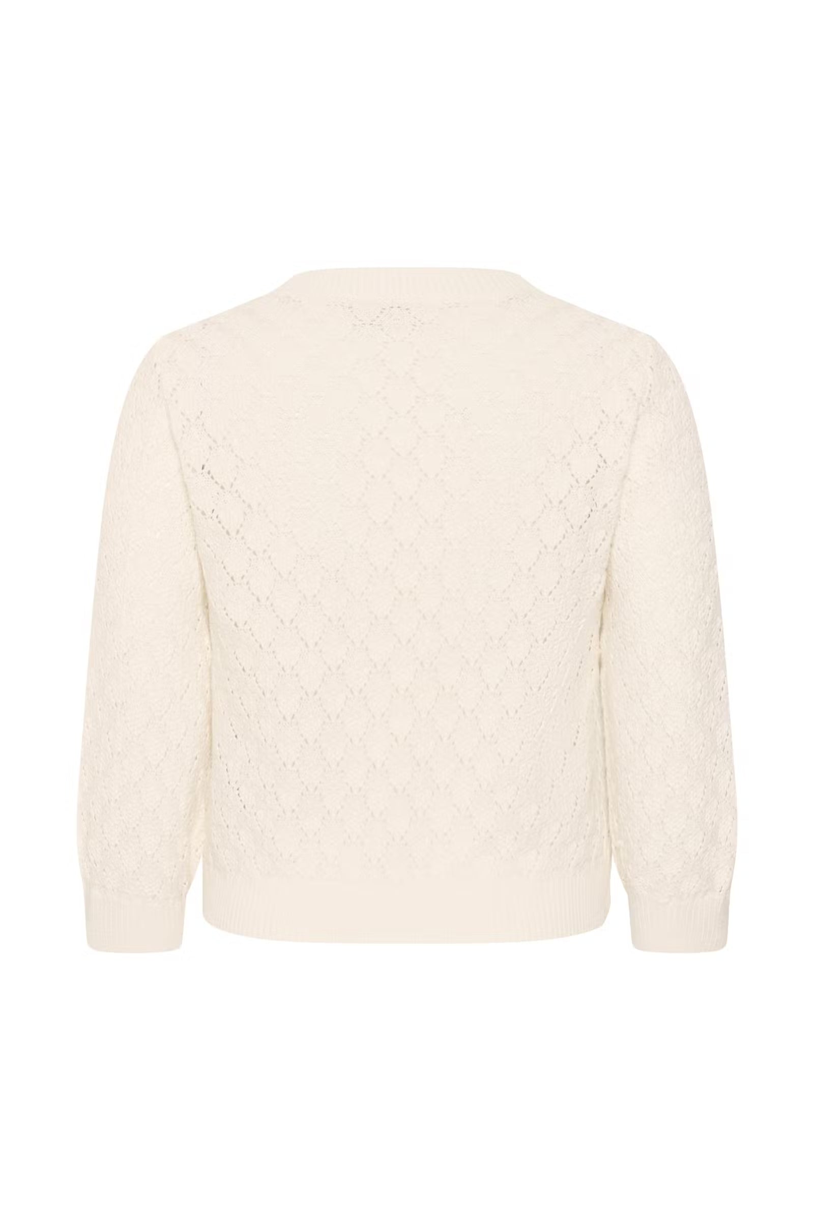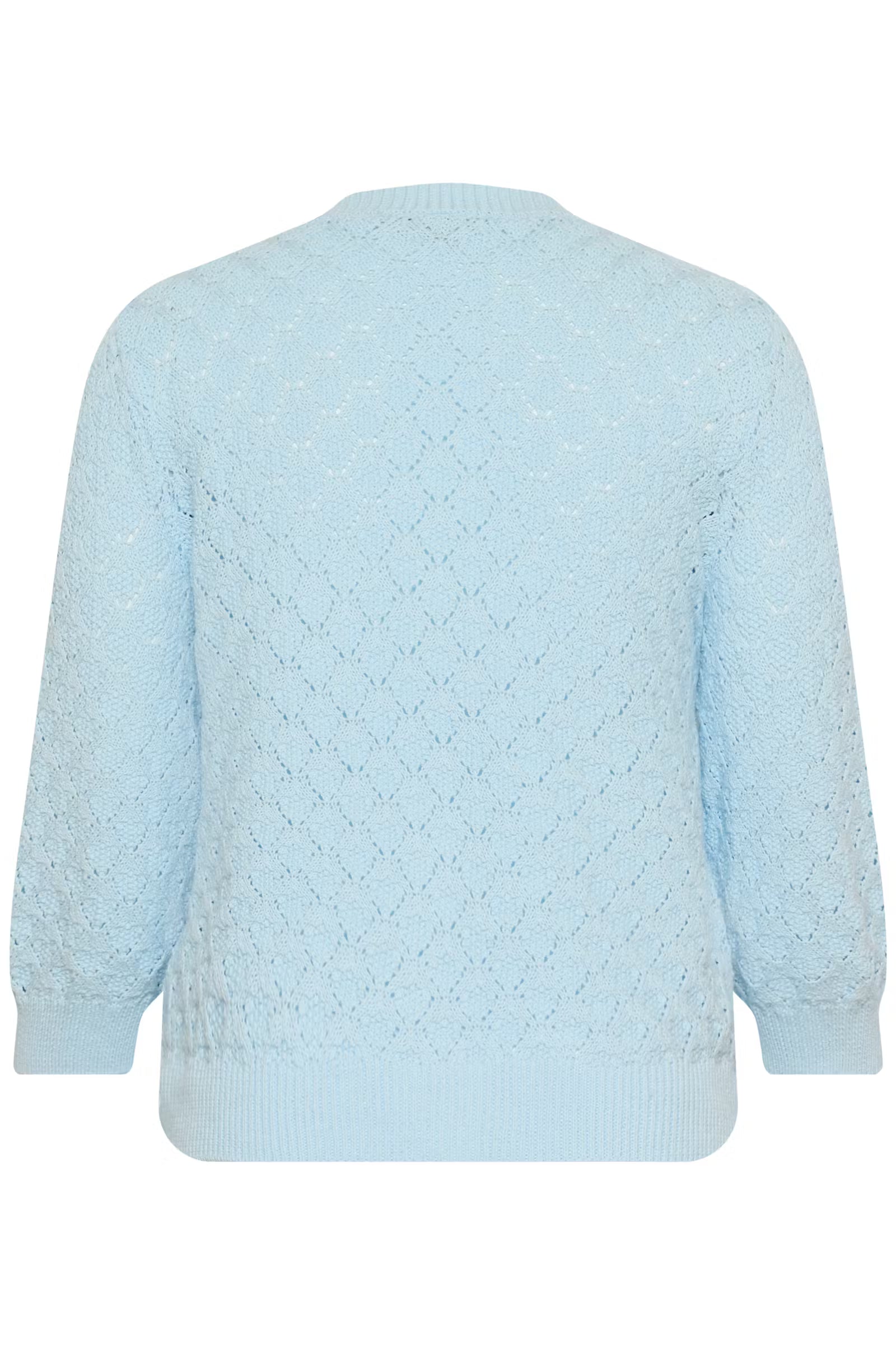 Het model is iets korter en valt mooi tot op de heup, met een licht losvallende fit die super flatterend zit. De opengewerkte structuur met subtiel diamantpatroon geeft een fijne, vrouwelijke look, terwijl de driekwart mouwen zorgen voor een speelse en elegante touch.