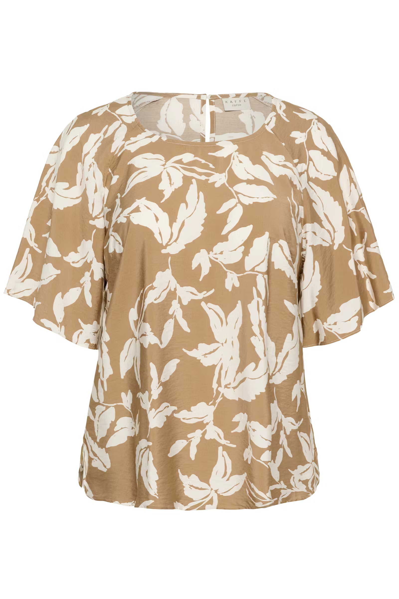 De blouse is afgewerkt met een ronde halslijn en wijde, licht uitlopende mouwen, wat zorgt voor een elegante en zomerse uitstraling. De donkerbeige kleur met witte bloemenprint maakt dit stuk tijdloos en makkelijk te combineren.