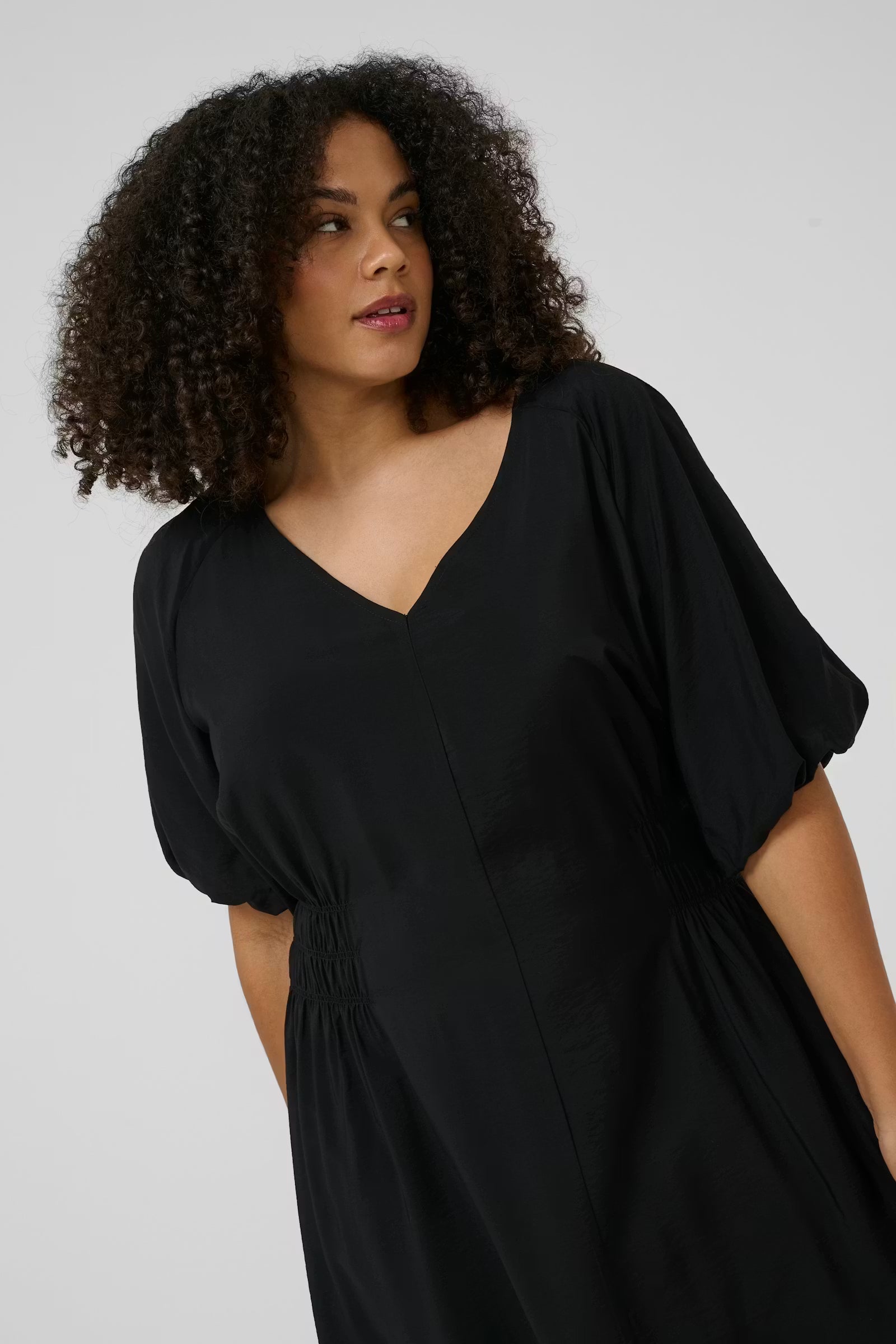 De V-hals en losse mouwen tot aan de elleboog geven het kleed een zachte en flatterende uitstraling. Dankzij de elastische taille wordt je silhouet subtiel geaccentueerd, terwijl het comfort volledig behouden blijft. De midi lengte valt mooi over de knie en zorgt voor een tijdloze en stijlvolle look.